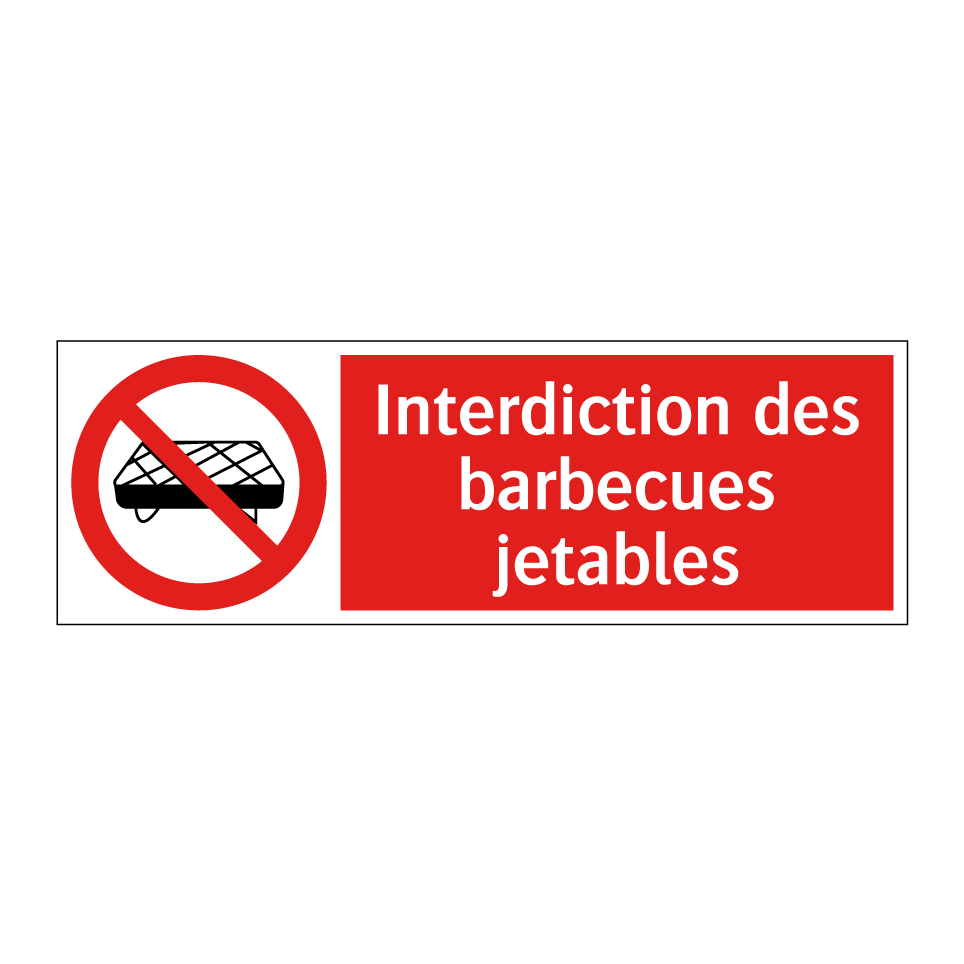Panneau d'interdiction avec le texte : "Interdiction des barbecues jetables" et une symbolique claire.