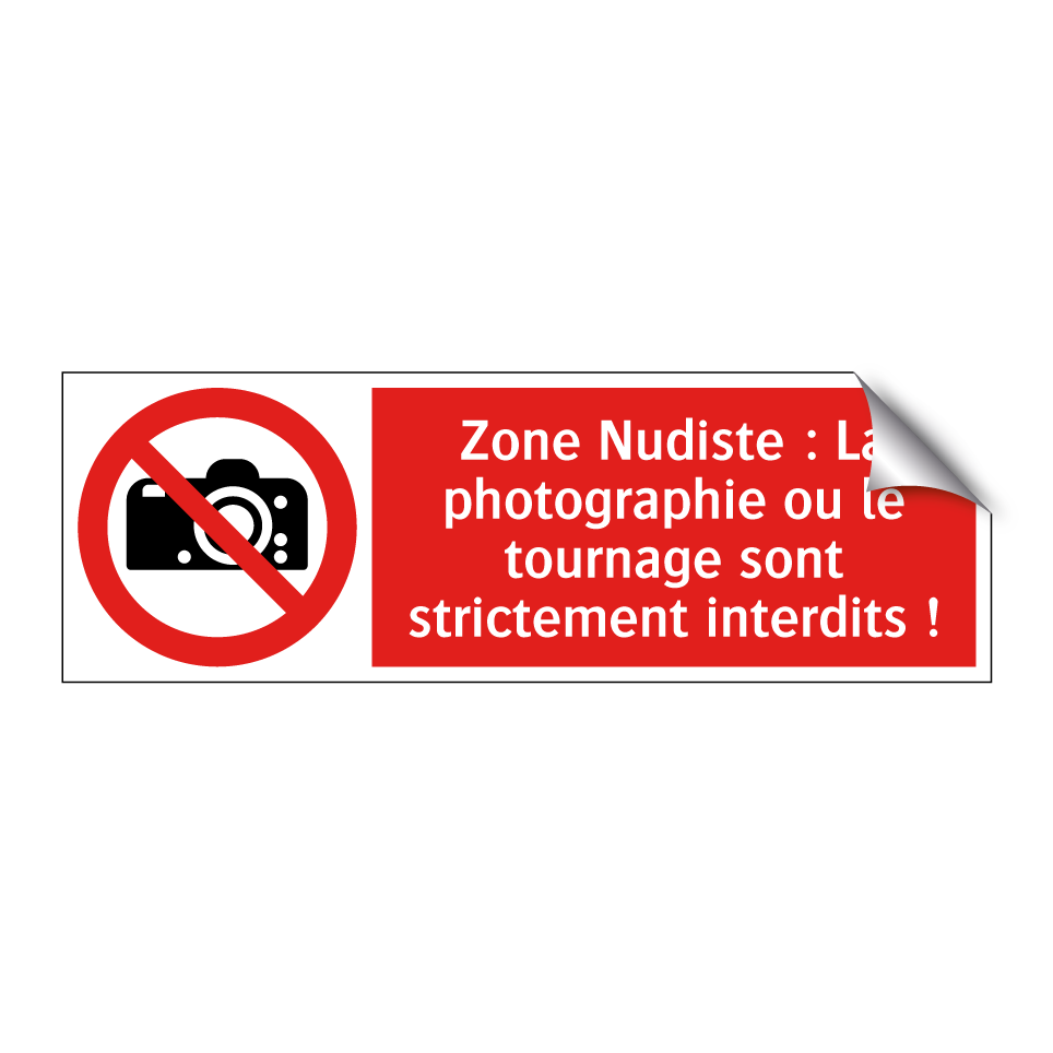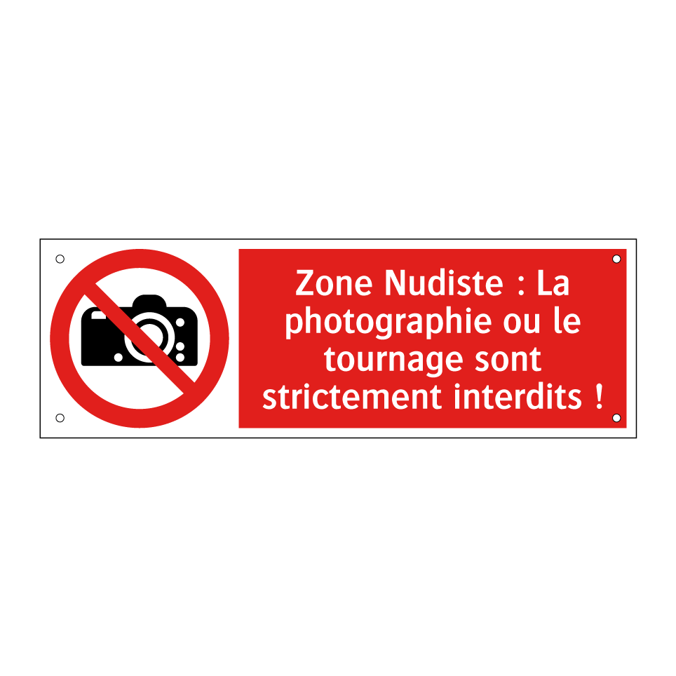 Panneau d'interdiction avec le texte : "Zone Nudiste : La photographie ou le tournage sont strictement interdits !" et une symbolique claire.