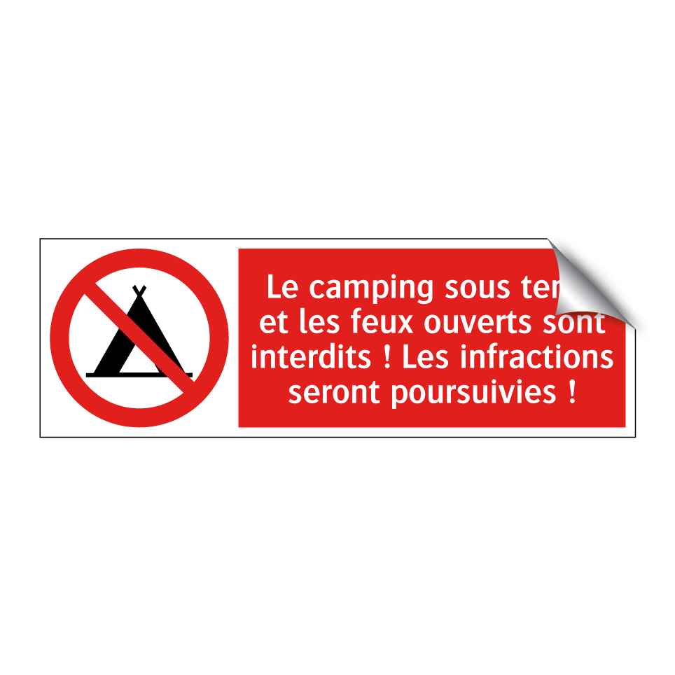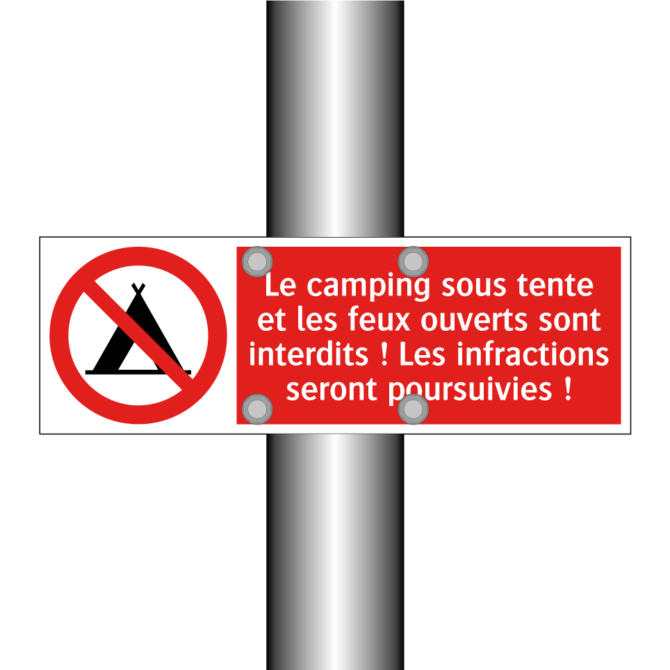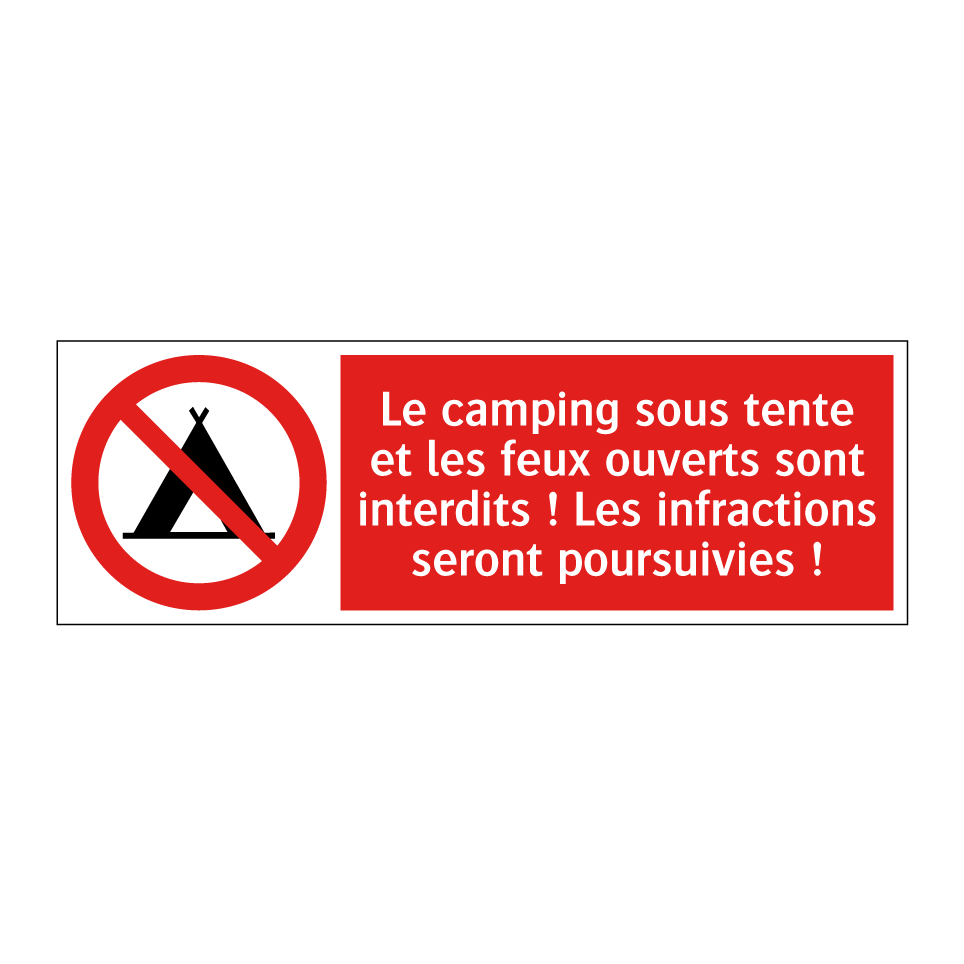 Panneau d'interdiction avec le texte : "Le camping sous tente et les feux ouverts sont interdits ! Les infractions seront poursuivies !" et une symbolique claire.