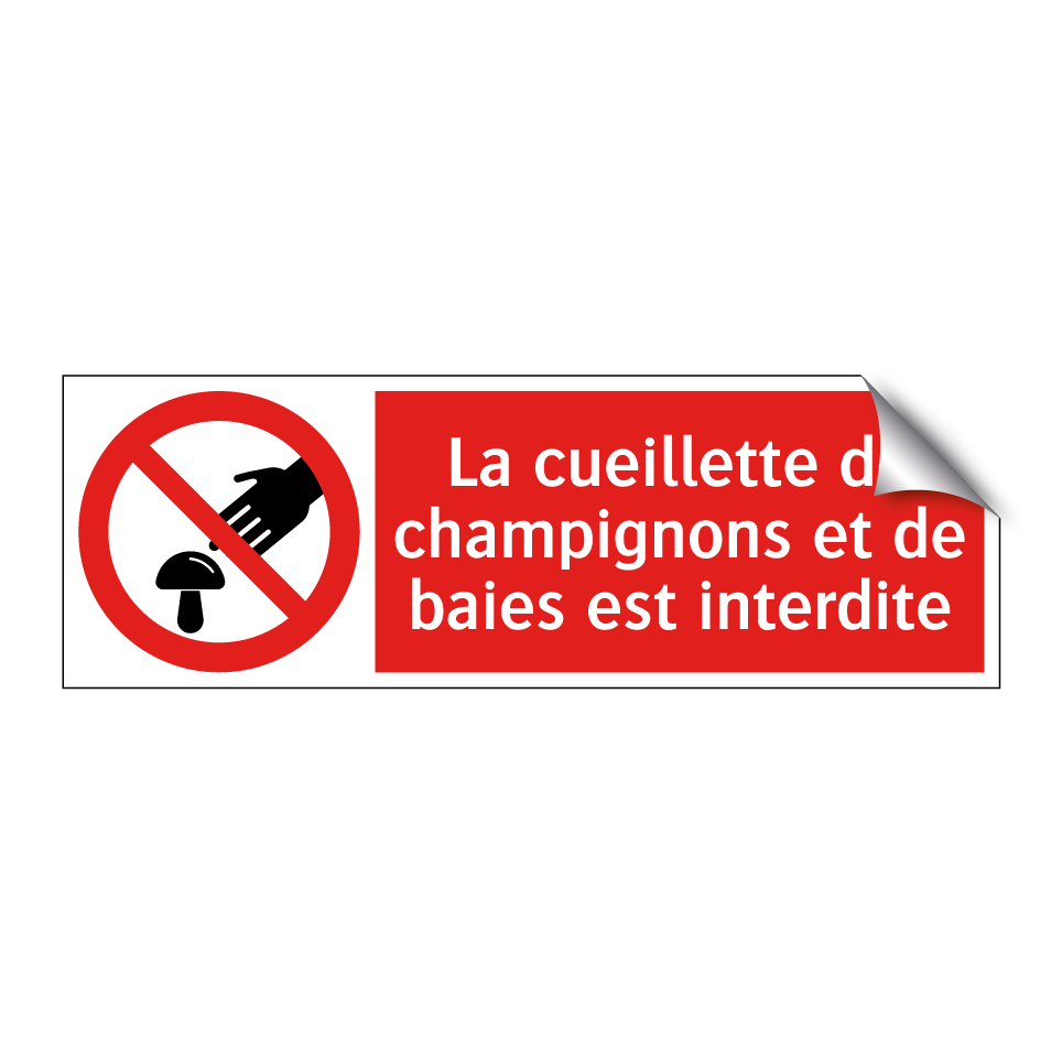 Panneau d'interdiction avec le texte : "La cueillette de champignons et de baies est interdite" et une symbolique claire.