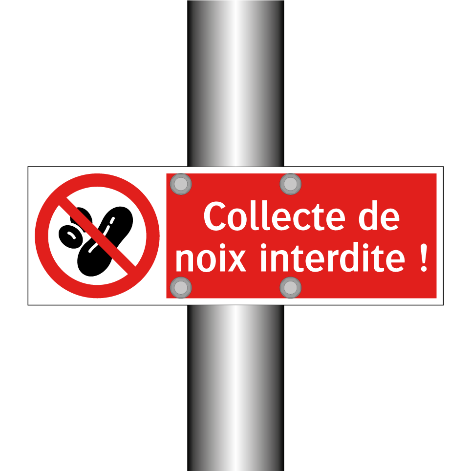 Panneau d'interdiction avec le texte : "Collecte de noix interdite !" et une symbolique claire.