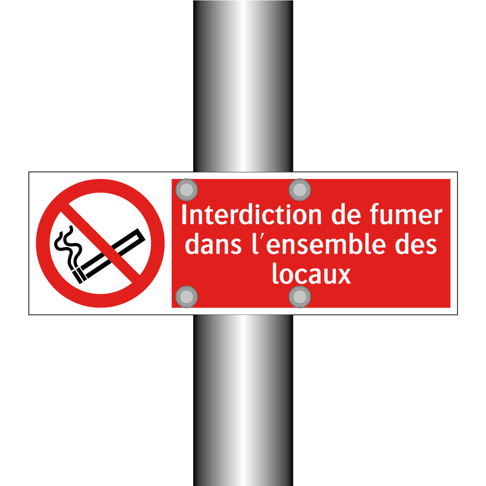 Panneau d'interdiction avec le texte : "Interdiction de fumer dans l'ensemble des locaux" et une symbolique claire.