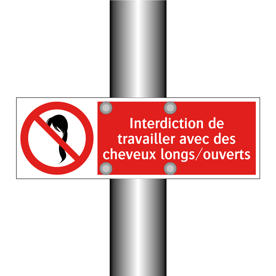 Panneau d'interdiction avec le texte : "Interdiction de travailler avec des cheveux longs/ouverts" et une symbolique claire.