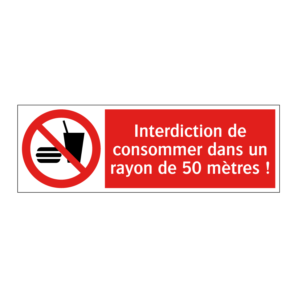 Panneau d'interdiction avec le texte : "Interdiction de consommer dans un rayon de 50 mètres !" et une symbolique claire.