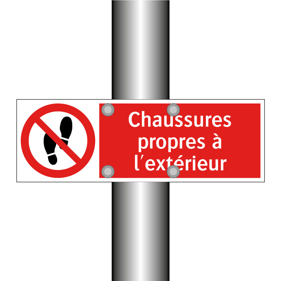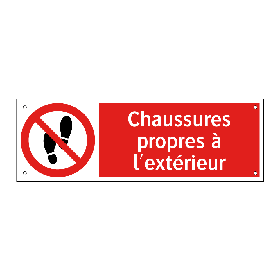 Panneau d'interdiction avec le texte : "Chaussures propres à l'extérieur" et une symbolique claire.