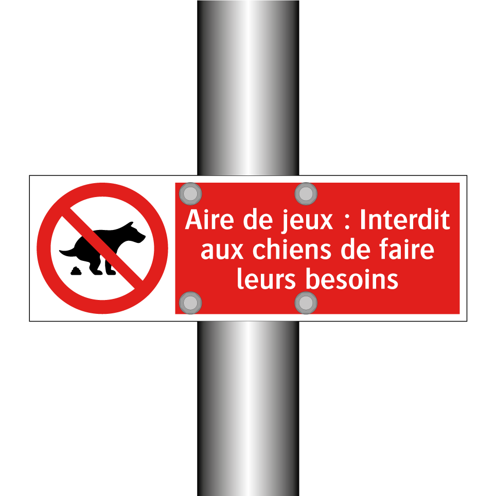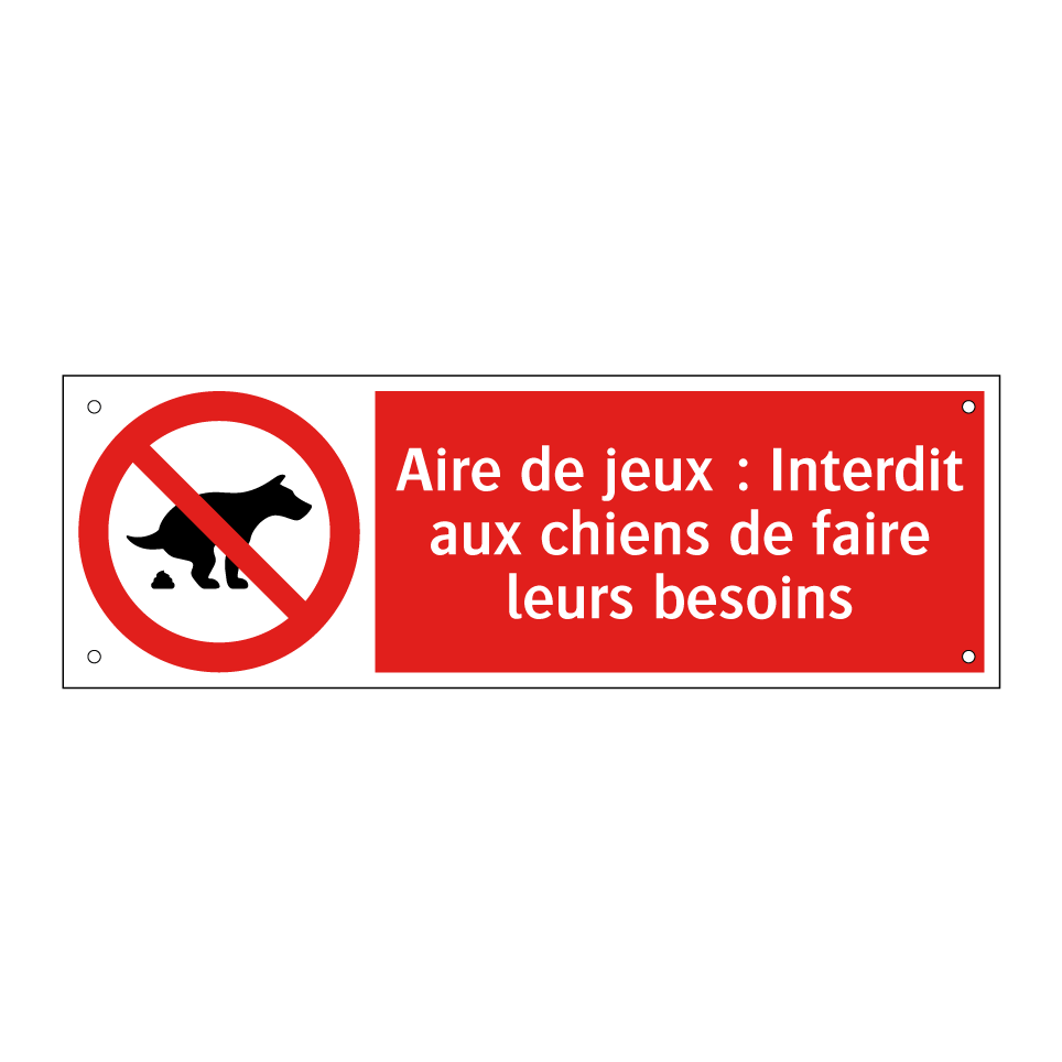 Panneau d'interdiction avec le texte : "Aire de jeux : Interdit aux chiens de faire leurs besoins" et une symbolique claire.