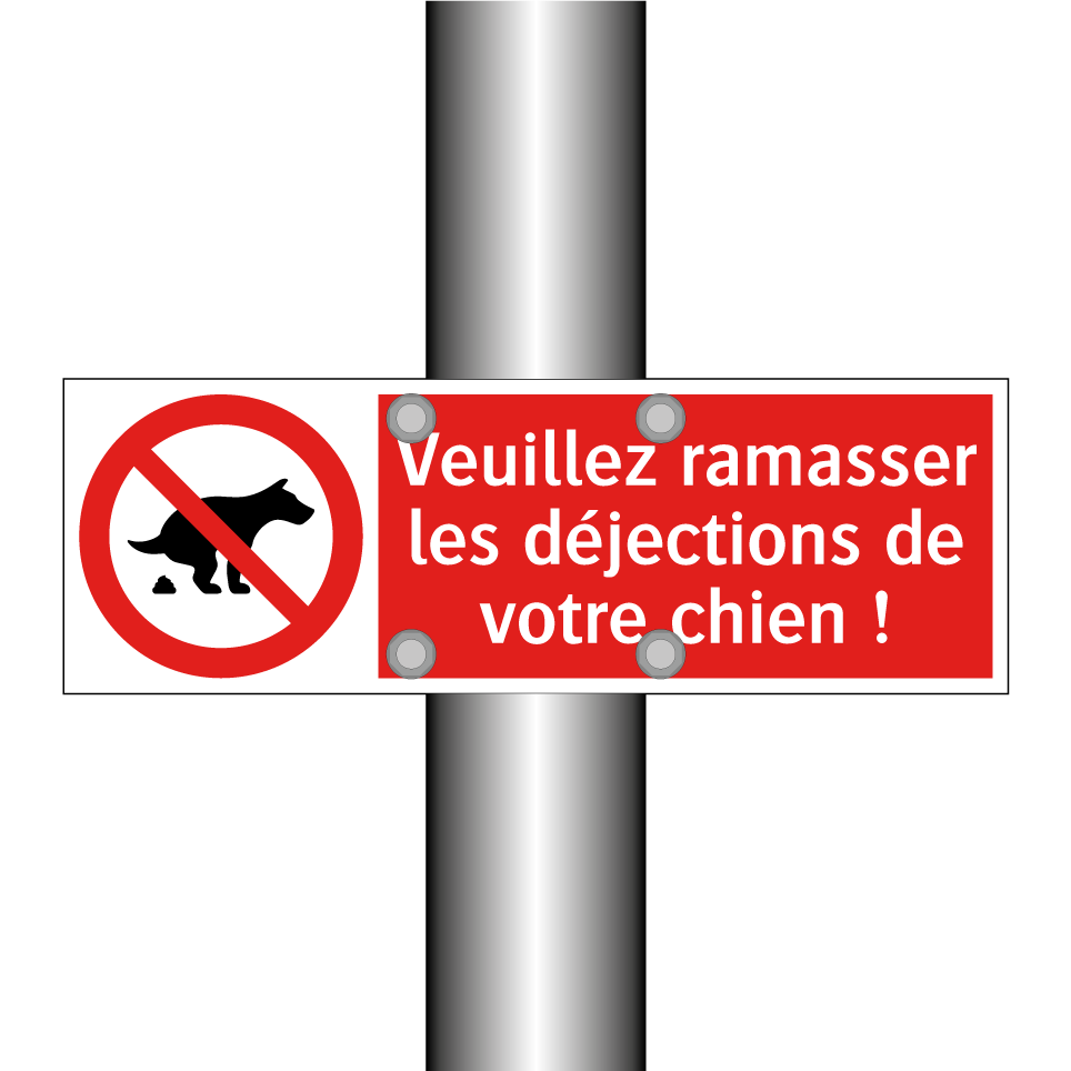Panneau d'interdiction avec le texte : "Veuillez ramasser les déjections de votre chien !" et une symbolique claire.