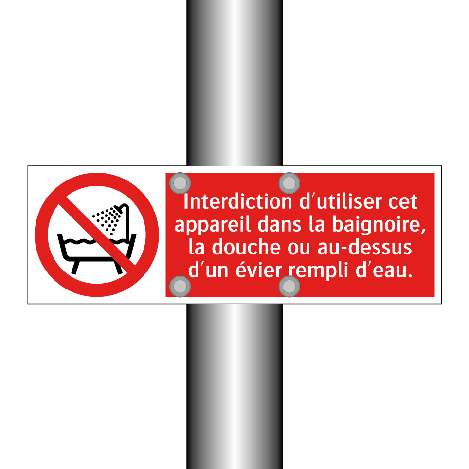 Panneau d'interdiction avec le texte : "Interdiction d'utiliser cet appareil dans la baignoire, la douche ou au-dessus d'un évier rempli d'eau." et une symbolique claire.