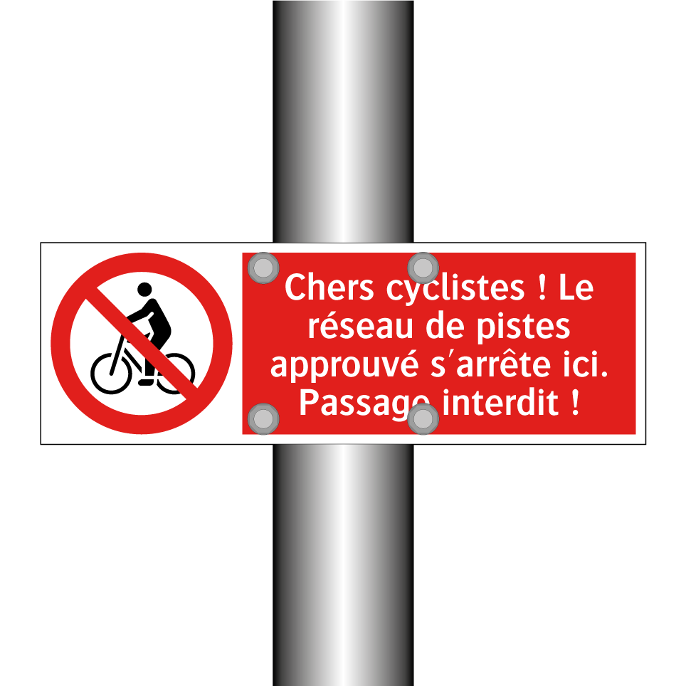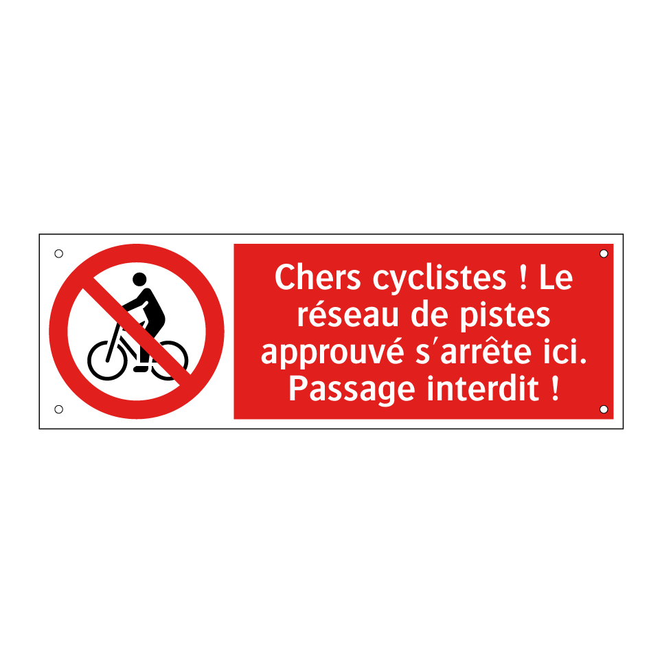 Panneau d'interdiction avec le texte : "Chers cyclistes ! Le réseau de pistes approuvé s'arrête ici. Passage interdit !" et une symbolique claire.