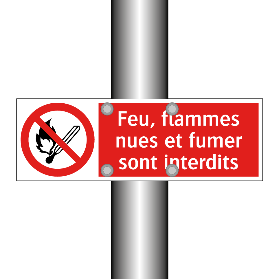 Panneau d'interdiction avec le texte : "Feu, flammes nues et fumer sont interdits" et une symbolique claire.
