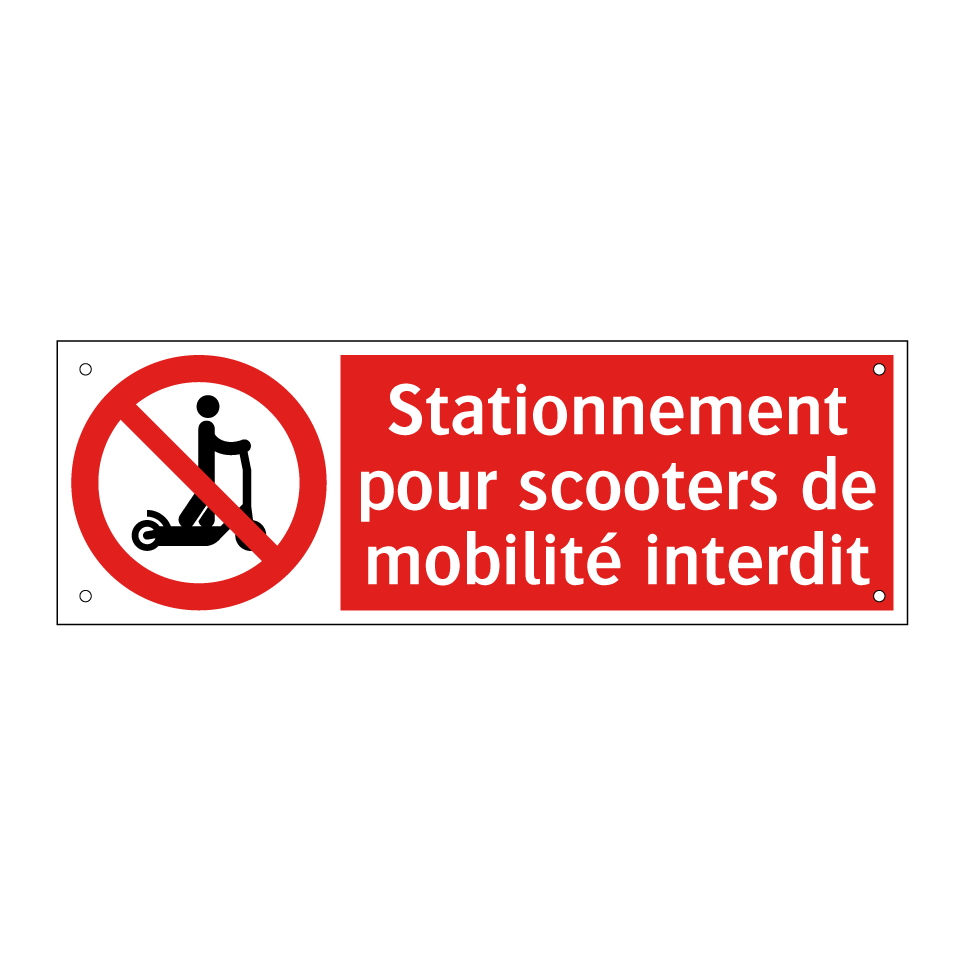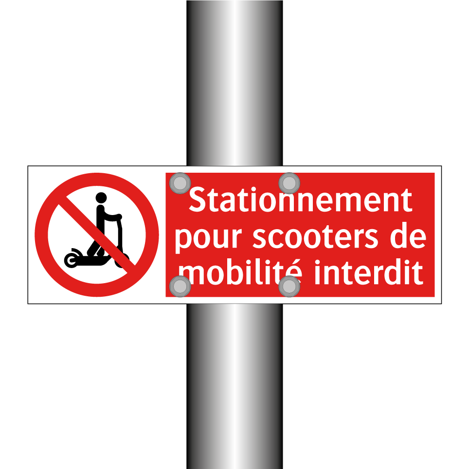 Panneau d'interdiction avec le texte : "Stationnement pour scooters de mobilité interdit" et une symbolique claire.