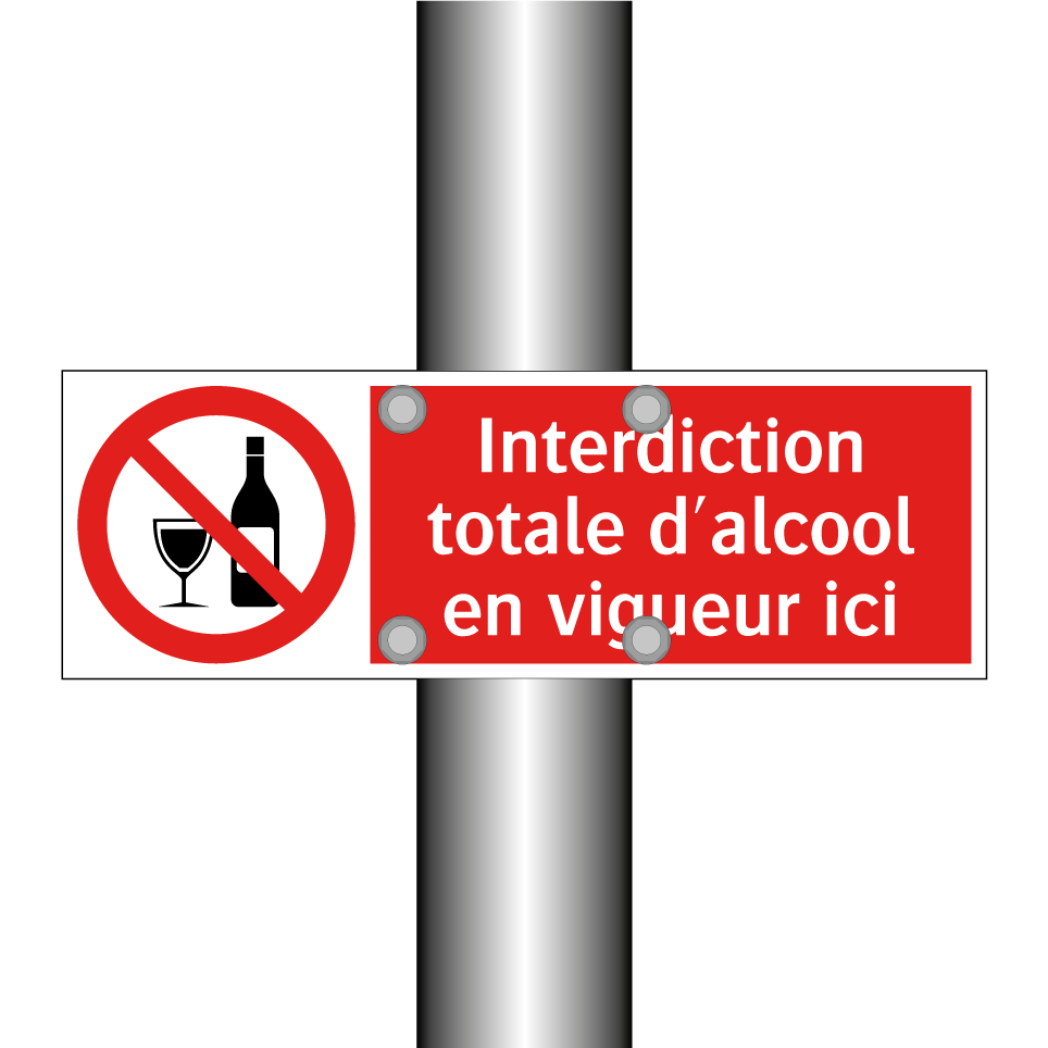 Panneau d'interdiction avec le texte : "Interdiction totale d'alcool en vigueur ici" et une symbolique claire.