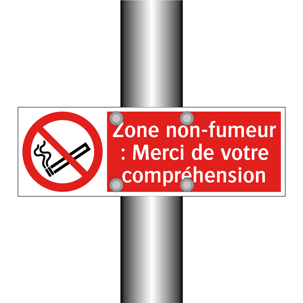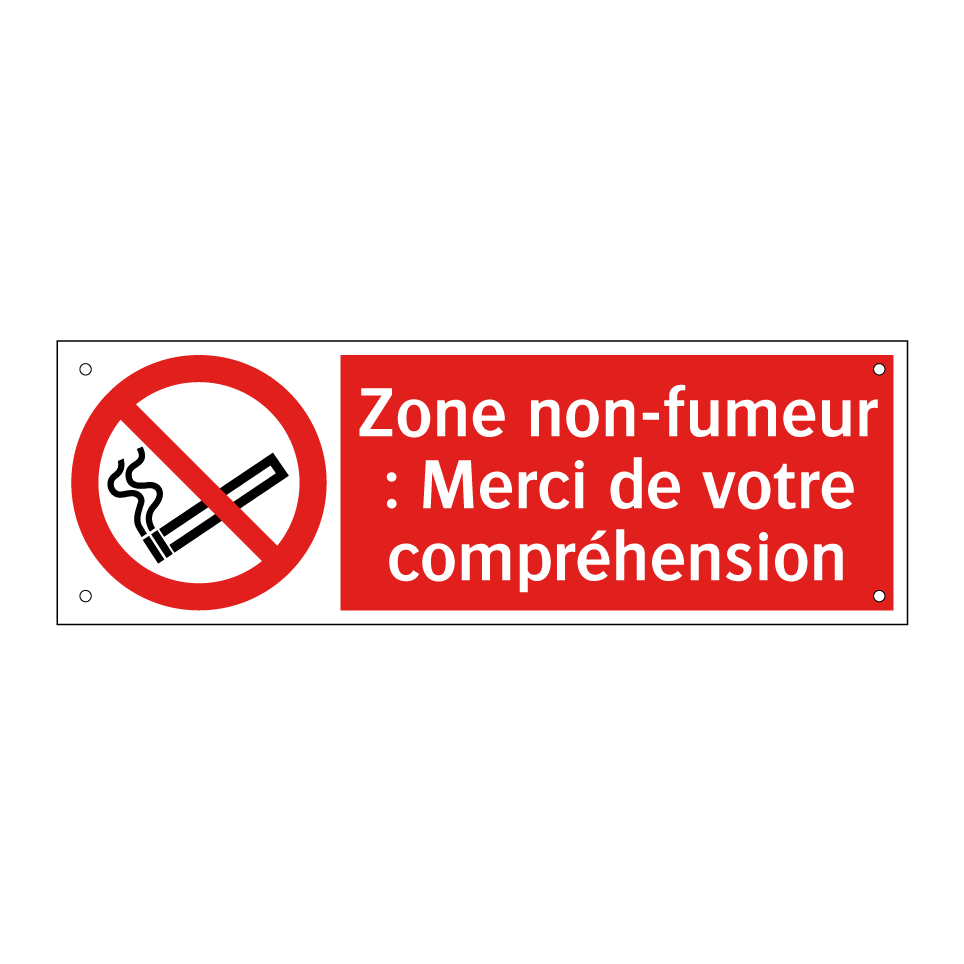 Panneau d'interdiction avec le texte : "Zone non-fumeur : Merci de votre compréhension" et une symbolique claire.