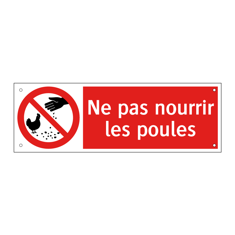 Panneau d'interdiction avec le texte : "Ne pas nourrir les poules" et une symbolique claire.