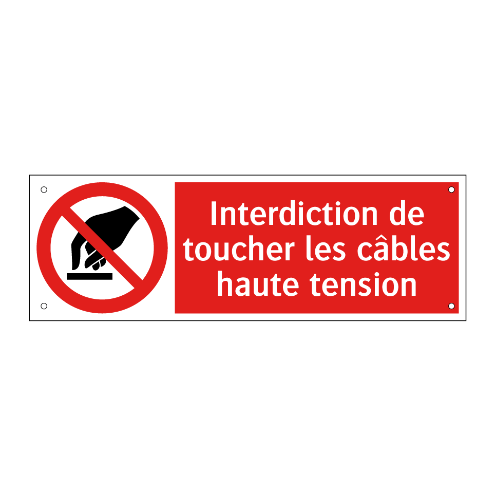 Panneau d'interdiction avec le texte : "Interdiction de toucher les câbles haute tension" et une symbolique claire.