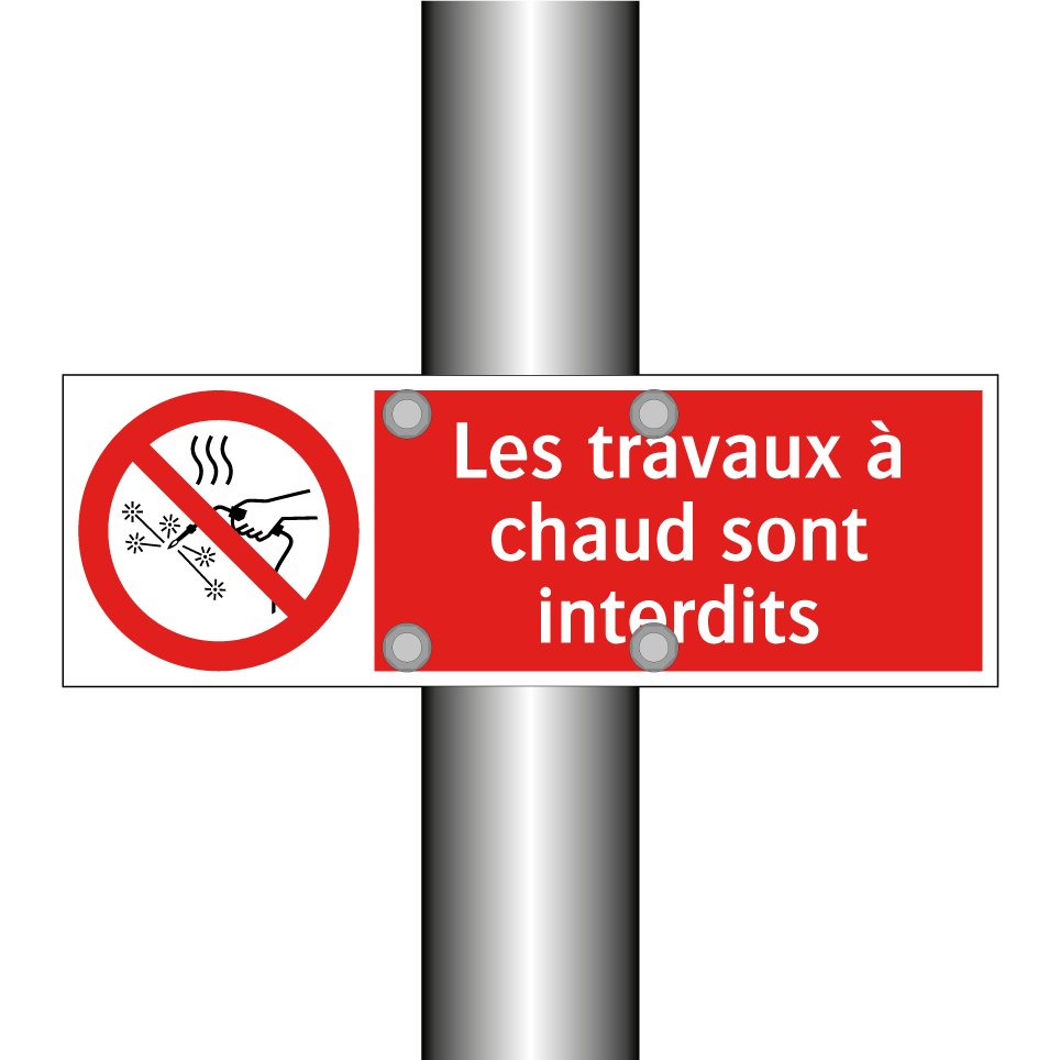 Panneau d'interdiction avec le texte : "Les travaux à chaud sont interdits" et une symbolique claire.
