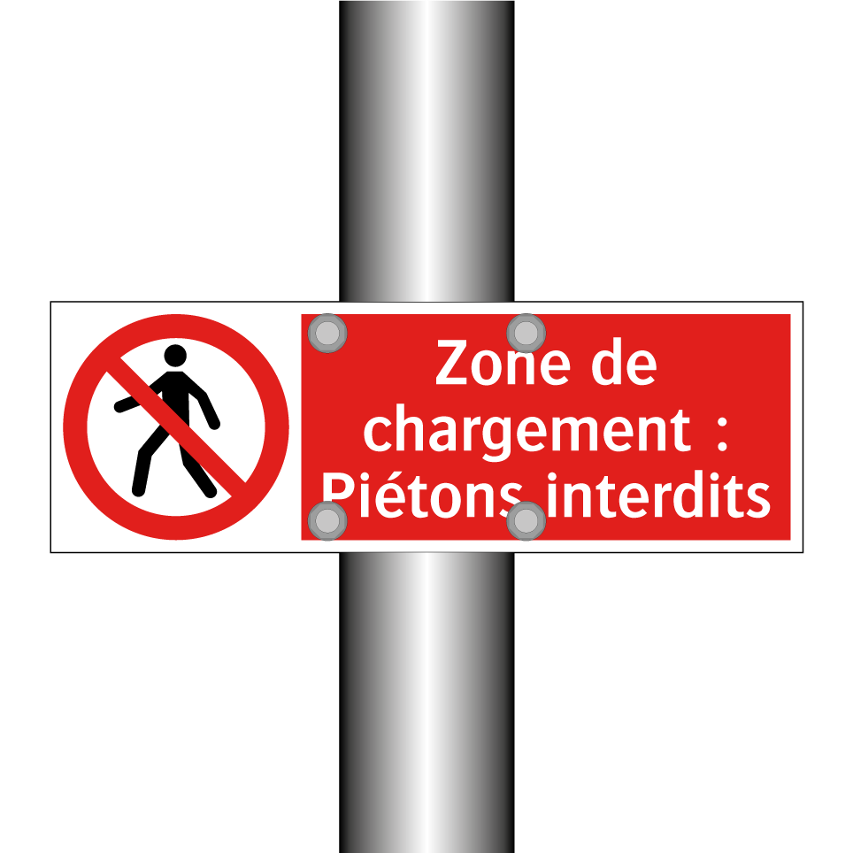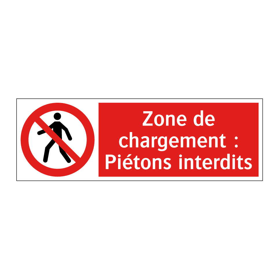 Panneau d'interdiction avec le texte : "Zone de chargement : Piétons interdits" et une symbolique claire.