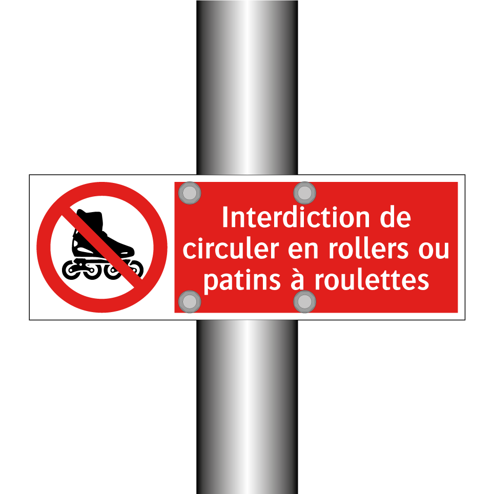 Panneau d'interdiction avec le texte : "Interdiction de circuler en rollers ou patins à roulettes" et une symbolique claire.
