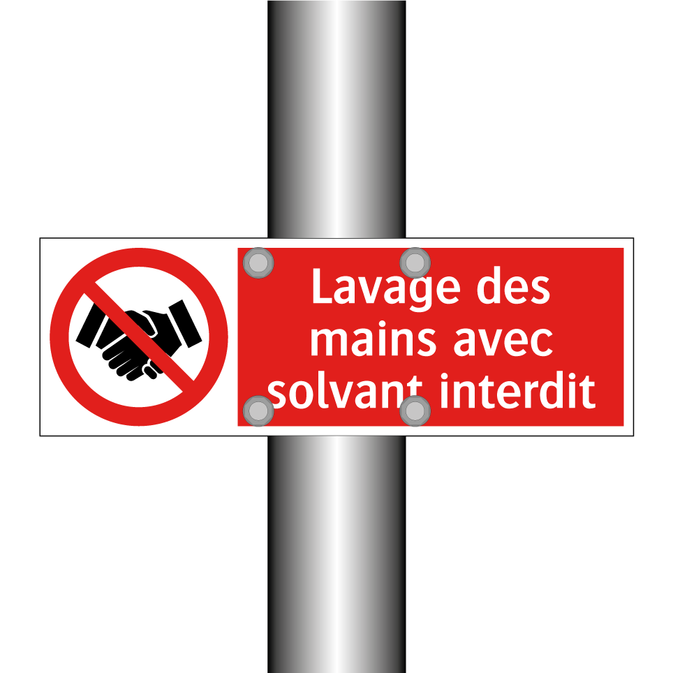 Panneau d'interdiction avec le texte : "Lavage des mains avec solvant interdit" et une symbolique claire.