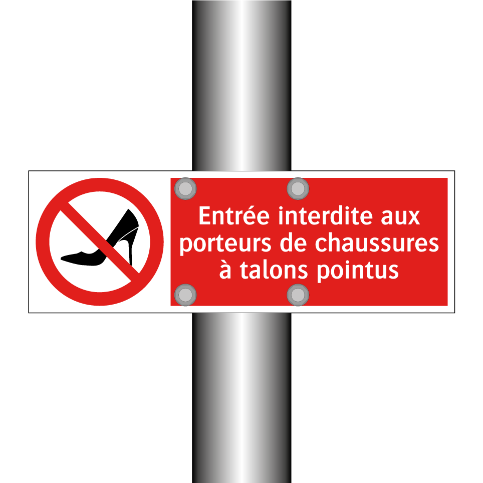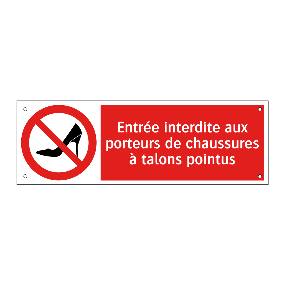Panneau d'interdiction avec le texte : "Entrée interdite aux porteurs de chaussures à talons pointus" et une symbolique claire.