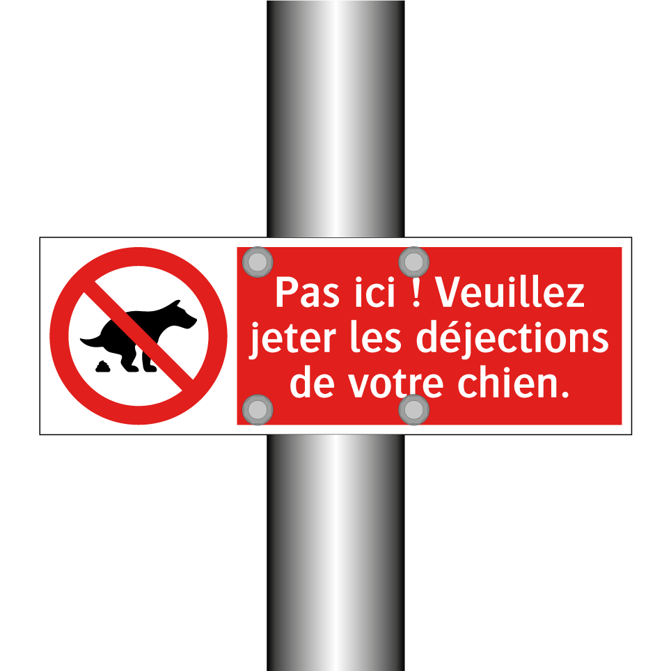 Panneau d'interdiction avec le texte : "Pas ici ! Veuillez jeter les déjections de votre chien." et une symbolique claire.