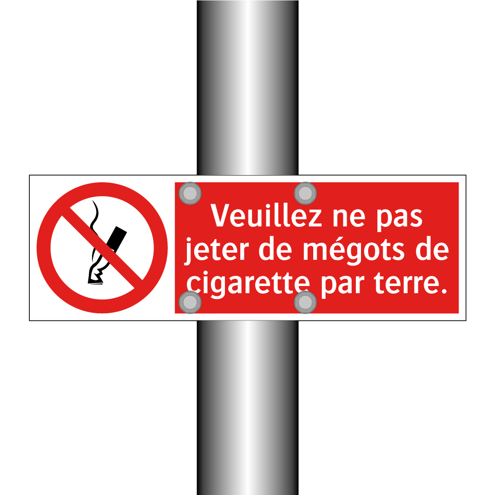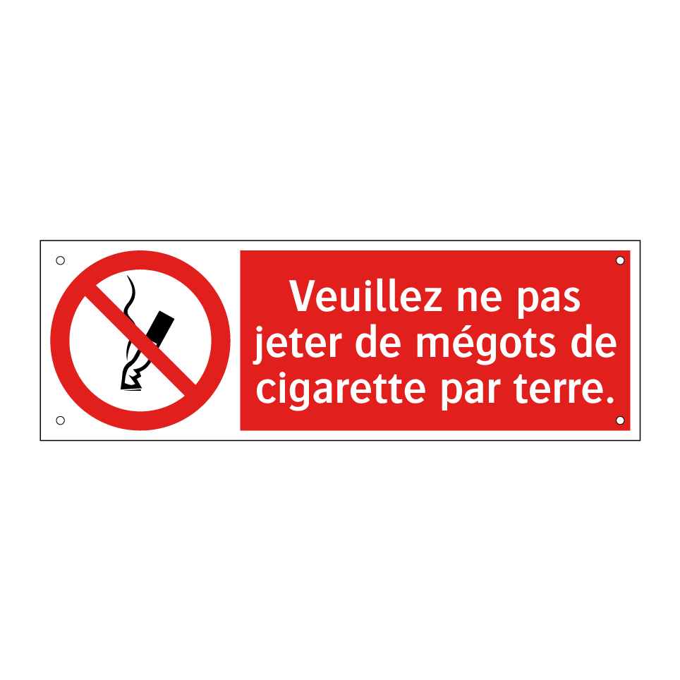 Panneau d'interdiction avec le texte : "Veuillez ne pas jeter de mégots de cigarette par terre." et une symbolique claire.