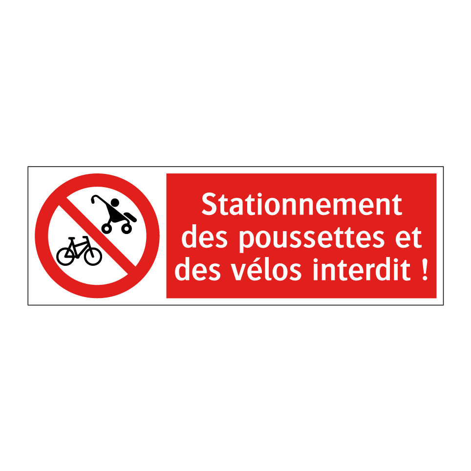 Panneau d'interdiction avec le texte : "Stationnement des poussettes et des vélos interdit !" et une symbolique claire.
