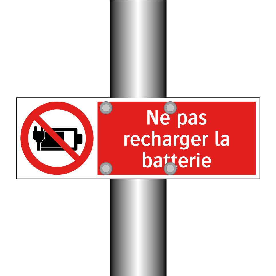 Panneau d'interdiction avec le texte : "Ne pas recharger la batterie" et une symbolique claire.