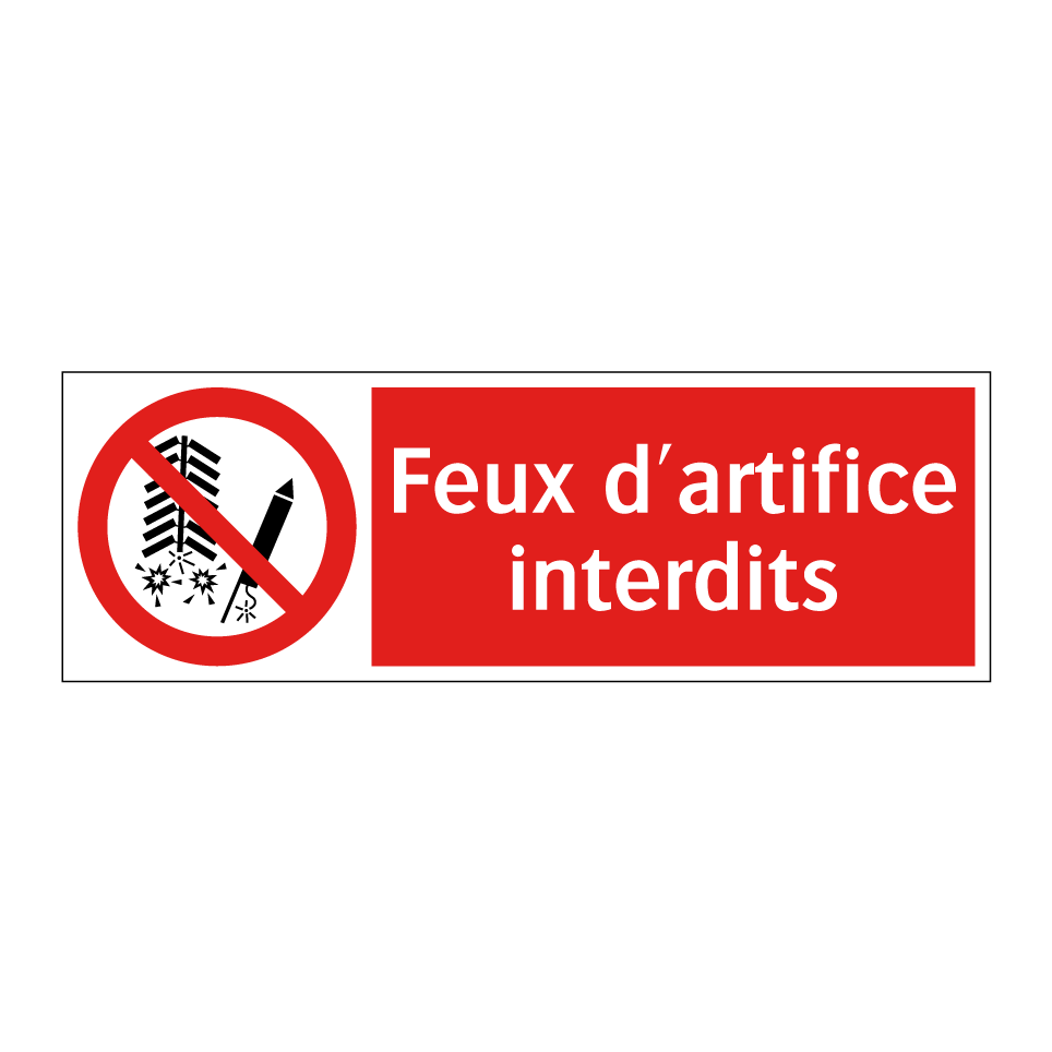 Panneau d'interdiction avec le texte : "Feux d'artifice interdits" et une symbolique claire.