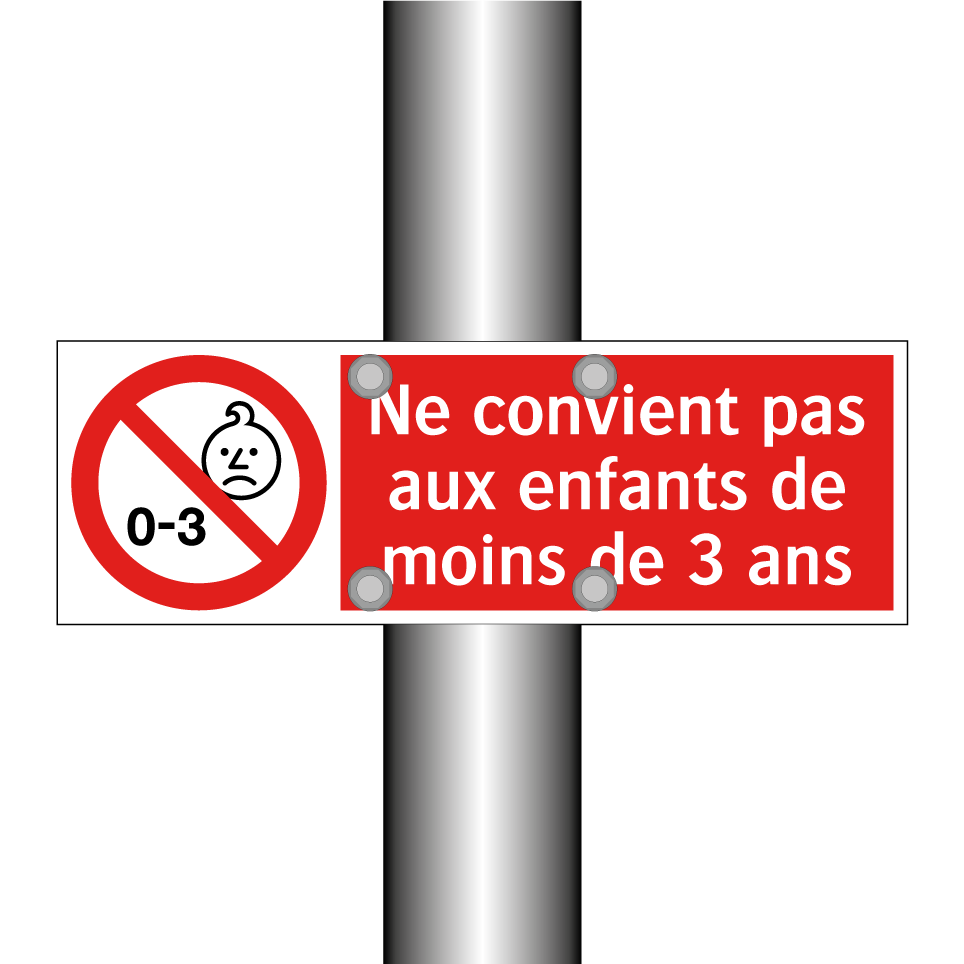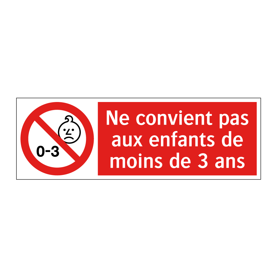Panneau d'interdiction avec le texte : "Ne convient pas aux enfants de moins de 3 ans" et une symbolique claire.
