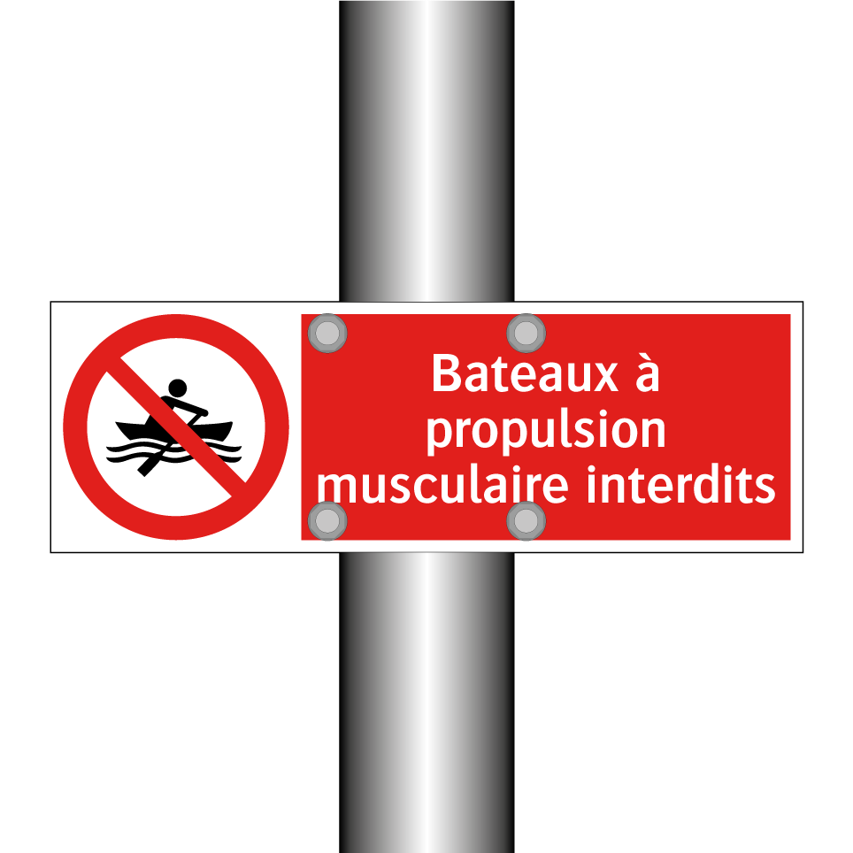 Panneau d'interdiction avec le texte : "Bateaux à propulsion musculaire interdits" et une symbolique claire.