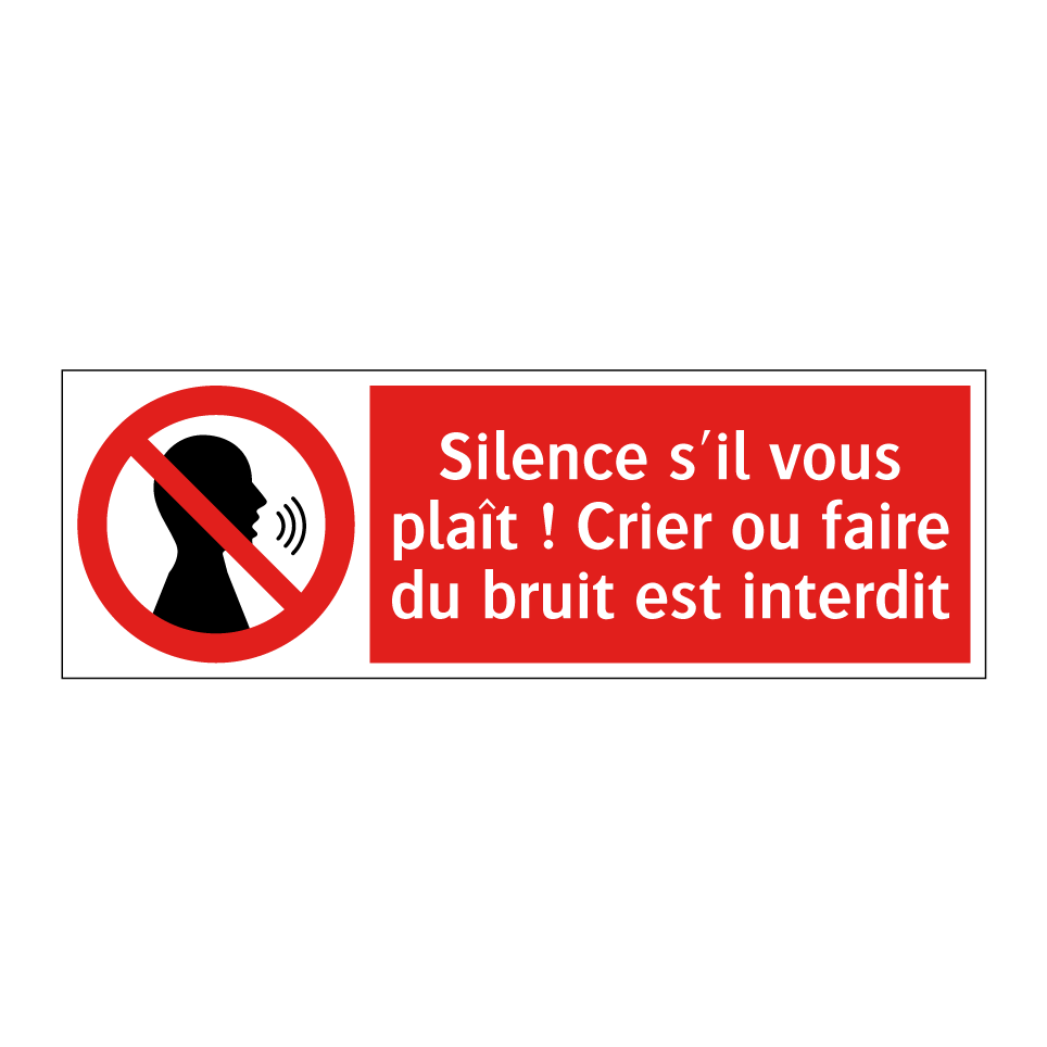 Panneau d'interdiction avec le texte : "Silence s'il vous plaît ! Crier ou faire du bruit est interdit" et une symbolique claire.