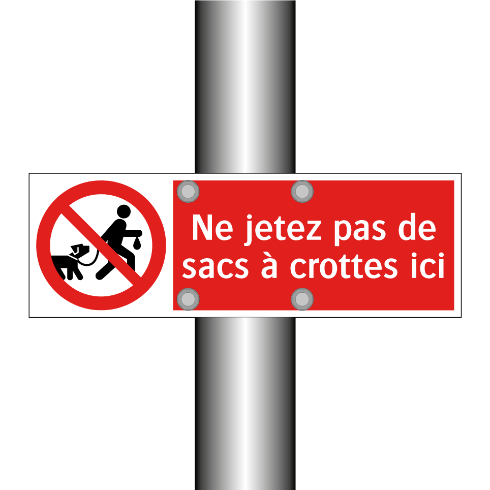 Panneau d'interdiction avec le texte : "Ne jetez pas de sacs à crottes ici" et une symbolique claire.