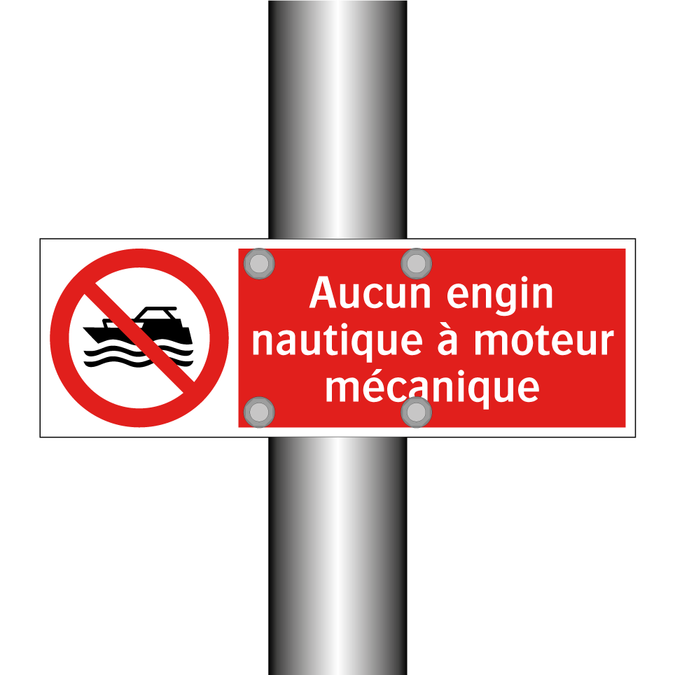 Panneau d'interdiction avec le texte : "Aucun engin nautique à moteur mécanique" et une symbolique claire.