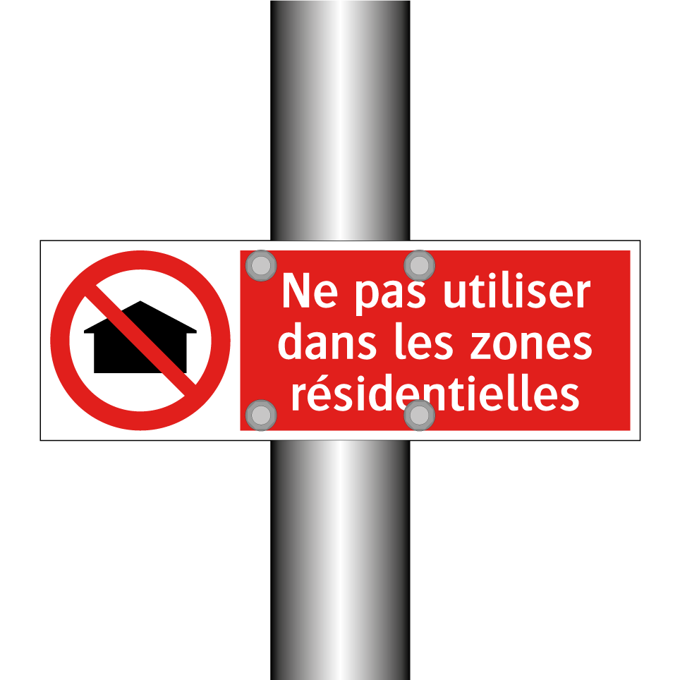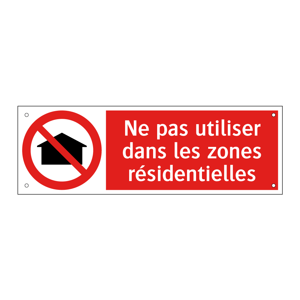 Panneau d'interdiction avec le texte : "Ne pas utiliser dans les zones résidentielles" et une symbolique claire.