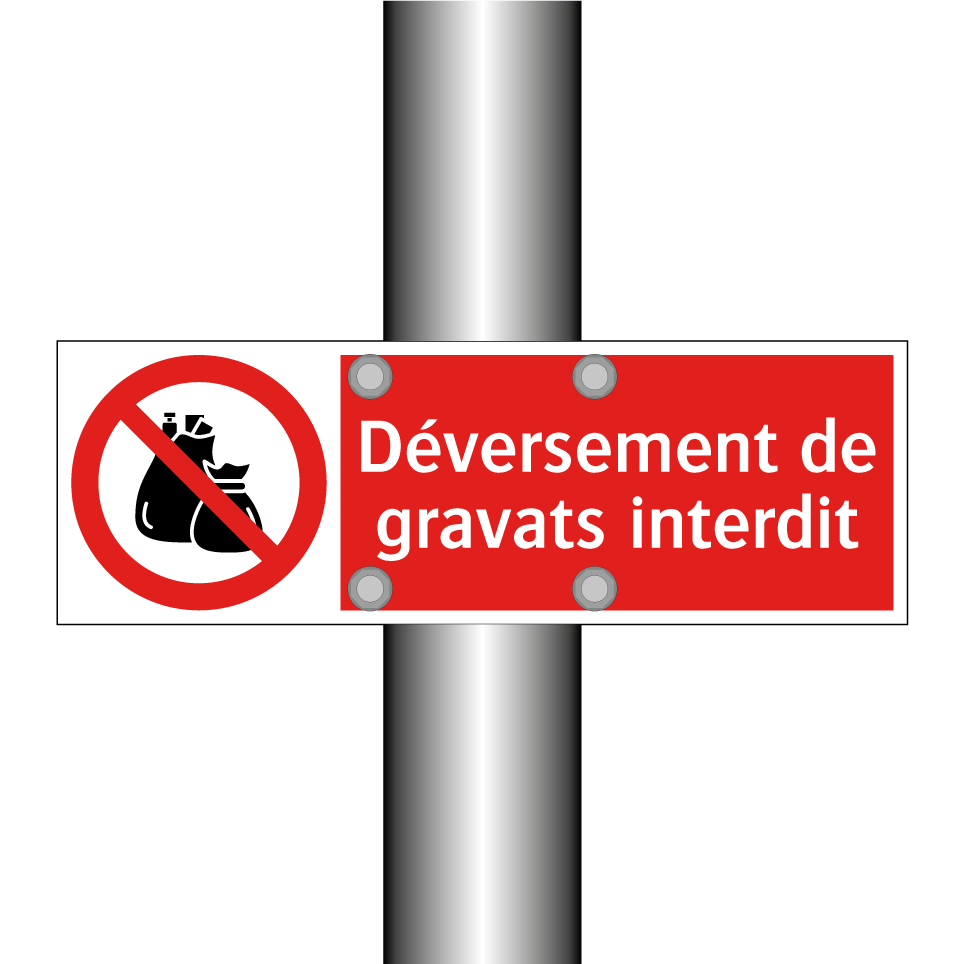 Panneau d'interdiction avec le texte : "Déversement de gravats interdit" et une symbolique claire.