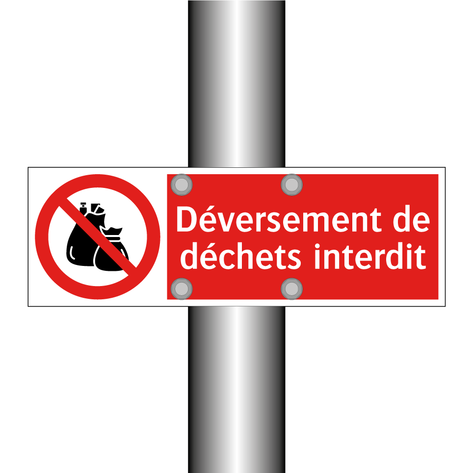 Panneau d'interdiction avec le texte : "Déversement de déchets interdit" et une symbolique claire.