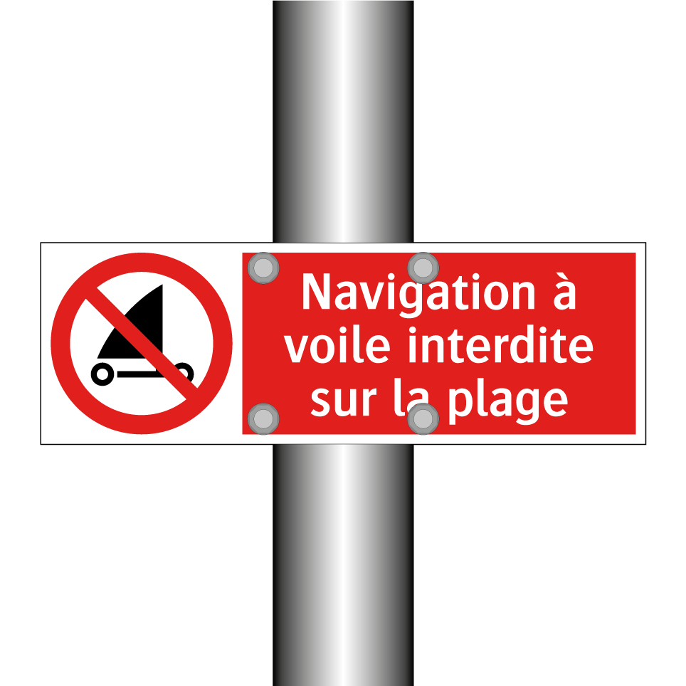Panneau d'interdiction avec le texte : "Navigation à voile interdite sur la plage" et une symbolique claire.