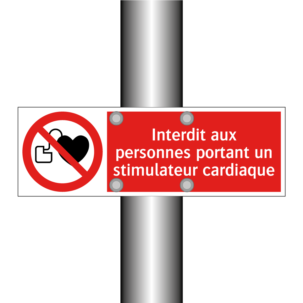 Panneau d'interdiction avec le texte : "Interdit aux personnes portant un stimulateur cardiaque" et une symbolique claire.