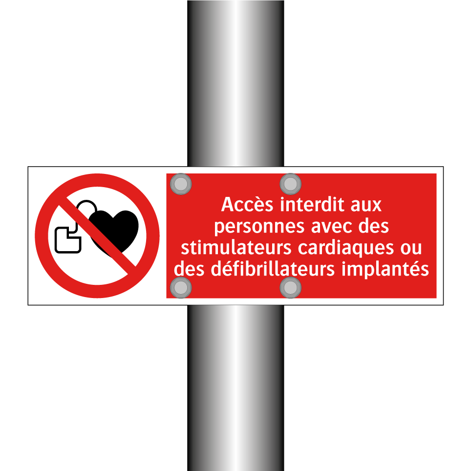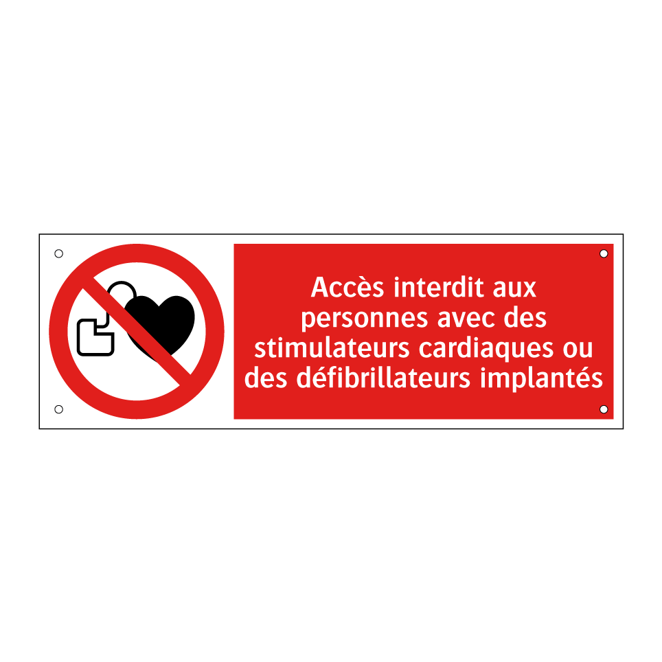 Panneau d'interdiction avec le texte : "Accès interdit aux personnes avec des stimulateurs cardiaques ou des défibrillateurs implantés" et une symbolique claire.