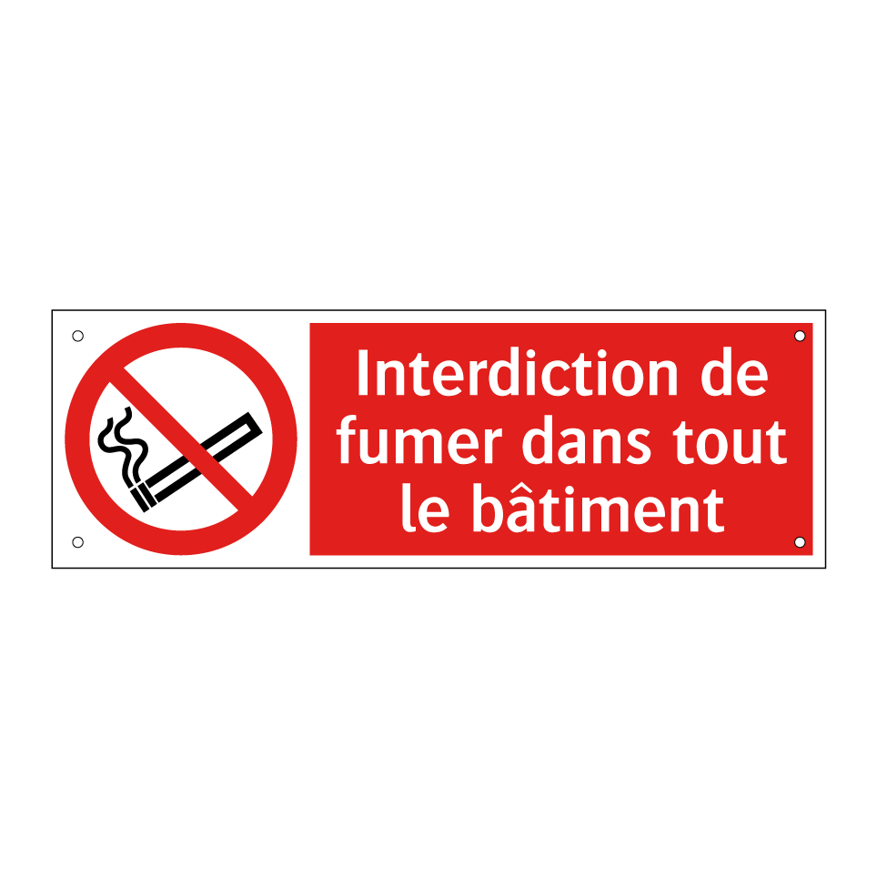 Panneau d'interdiction avec le texte : "Interdiction de fumer dans tout le bâtiment" et une symbolique claire.