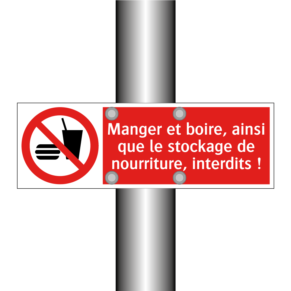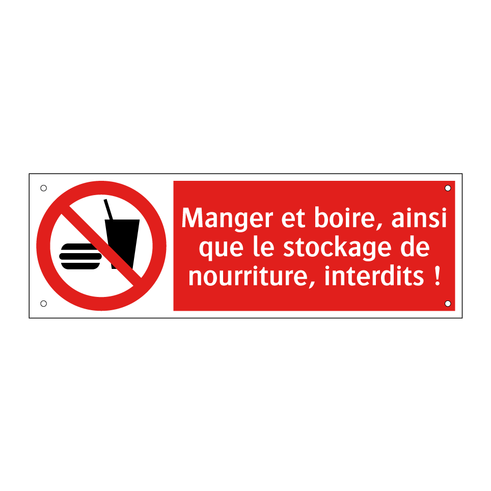 Panneau d'interdiction avec le texte : "Manger et boire, ainsi que le stockage de nourriture, interdits !" et une symbolique claire.