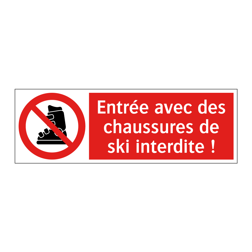 Panneau d'interdiction avec le texte : "Entrée avec des chaussures de ski interdite !" et une symbolique claire.