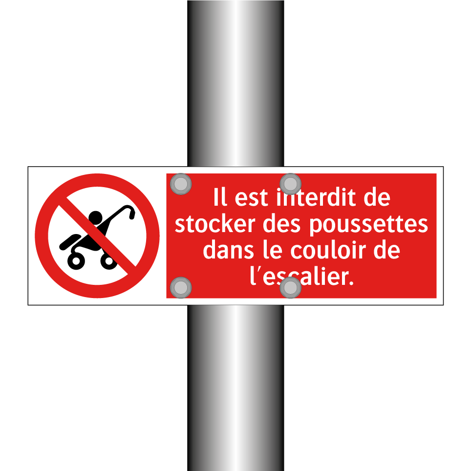Panneau d'interdiction avec le texte : "Il est interdit de stocker des poussettes dans le couloir de l'escalier." et une symbolique claire.