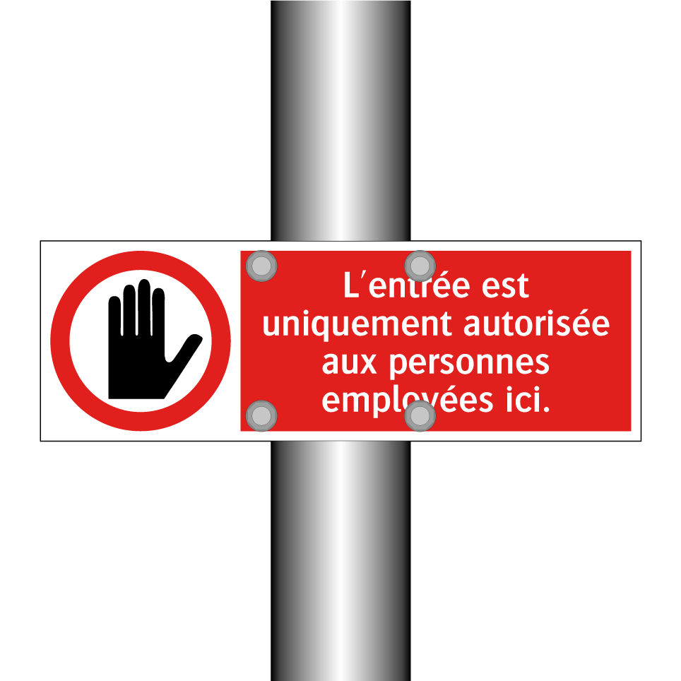 Panneau d'interdiction avec le texte : "L'entrée est uniquement autorisée aux personnes employées ici." et une symbolique claire.