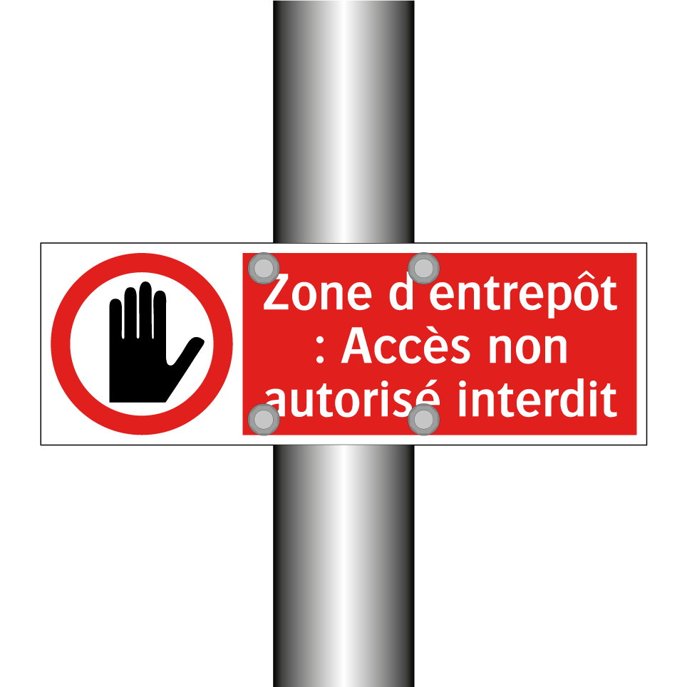 Panneau d'interdiction avec le texte : "Zone d'entrepôt : Accès non autorisé interdit" et une symbolique claire.