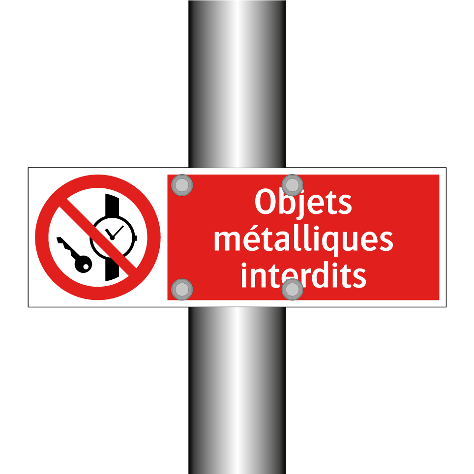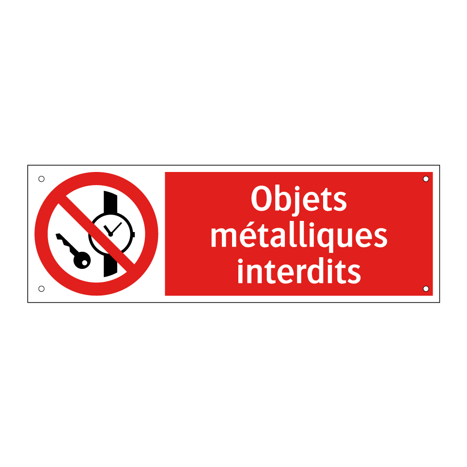 Panneau d'interdiction avec le texte : "Objets métalliques interdits" et une symbolique claire.