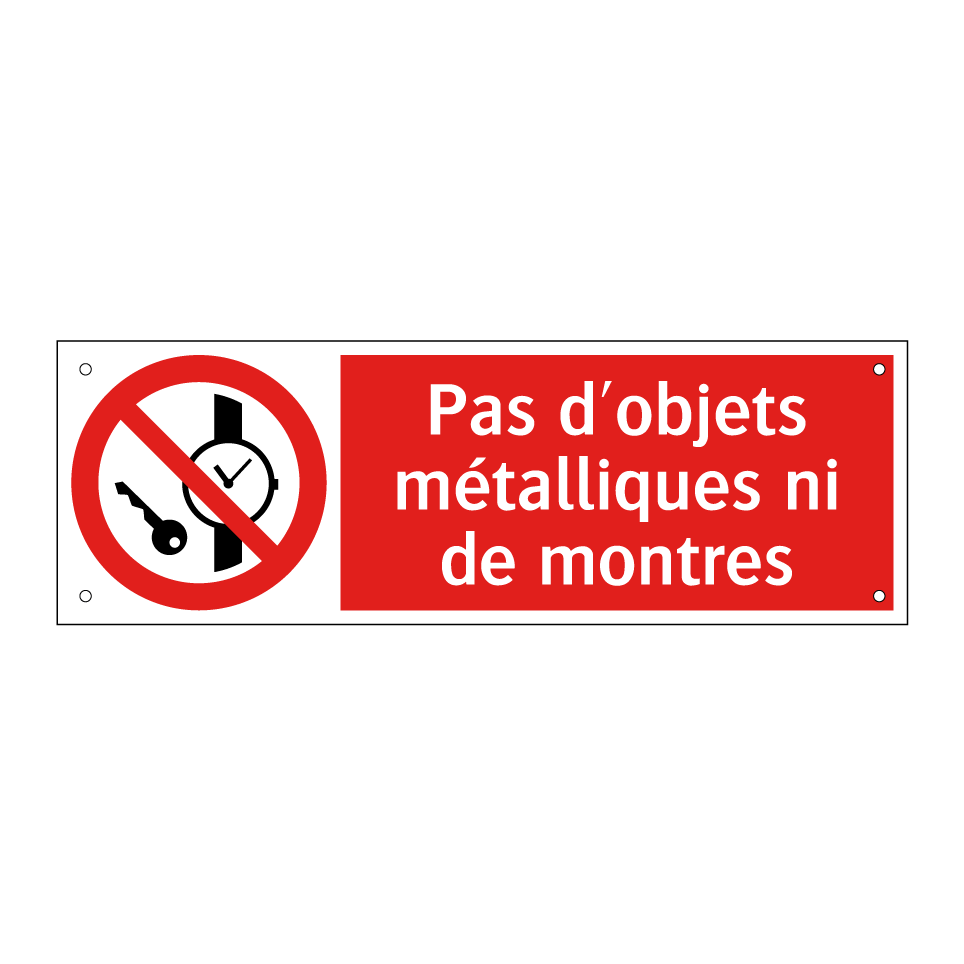 Panneau d'interdiction avec le texte : "Pas d'objets métalliques ni de montres" et une symbolique claire.