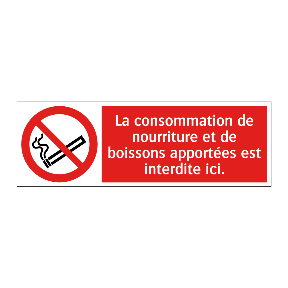 Panneau d'interdiction avec le texte : "La consommation de nourriture et de boissons apportées est interdite ici." et une symbolique claire.