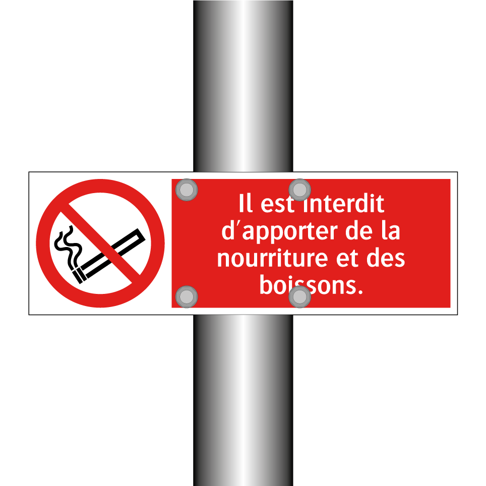 Panneau d'interdiction avec le texte : "Il est interdit d'apporter de la nourriture et des boissons." et une symbolique claire.